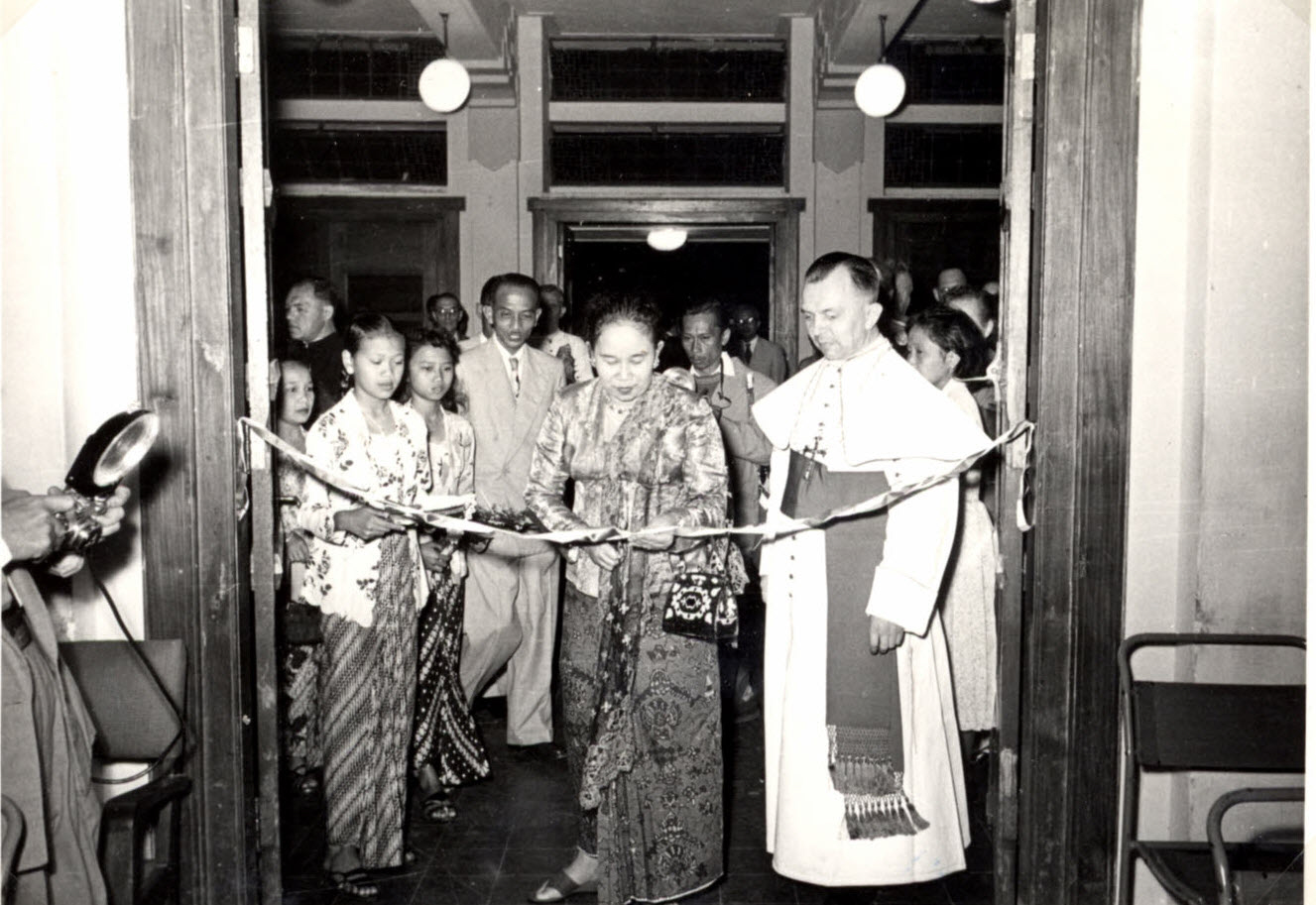 Mevrouw R. Sanusi Hardjadinata, de echtgenote van de gouverneur van West-Java, opende op 8 december 1956 een Mariatentoonstelling in het gebouw Panti Budaja. Een hartelijk woord van welkom tot de talrijke aanwezigen, waaronder R.O. Judakusumah, de coördinator voor onderwijs, opvoeding en cultuur voor West-Java, werd gesproken door Mgr. Petrus Arntz. Daarna sprak pastoor en kruisheer Harrie van Haaren (Cimahi, 1917 – Rome, 1975) over de betekenis van Maria voor alle volkeren.